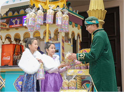 魔法將阿拉伯皇宮變成充滿甜甜氣息的甜蜜魔宮,舉國歡騰的奇幻嘉年華盛大展開盛會中有最璀璨的流金皇宮、最夢幻的大型甜點裝置、最濃郁的甜甜香氣、最熱鬧的異國市集、最繽紛的甜點美食、最神奇的街頭表演藝人,以及最童話的糖果情緣。