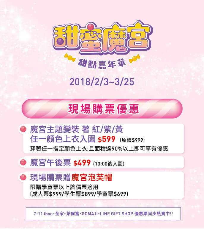 跳進糖果踢踏走廊彷彿回到童年時光,一起跟著糖果格子跳進最夢幻的甜蜜魔宮,享受最繽紛的歡樂時光。