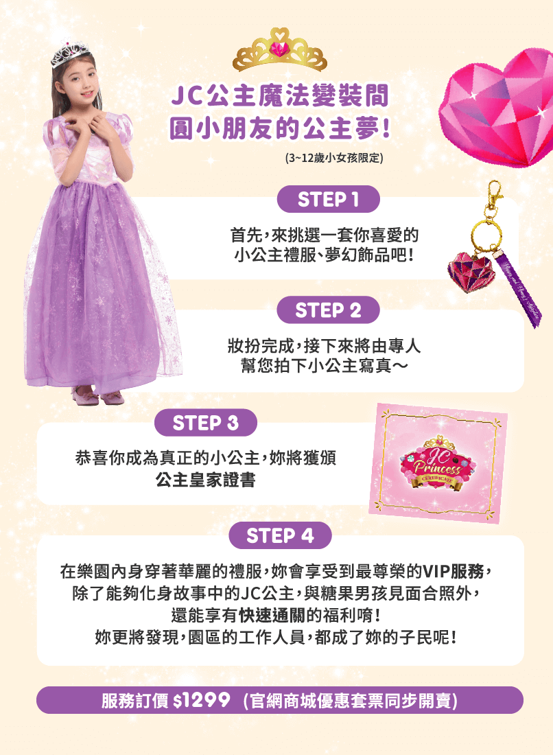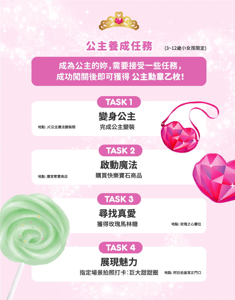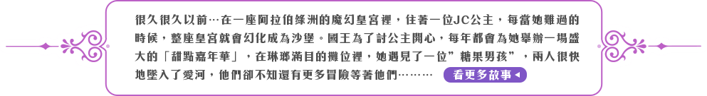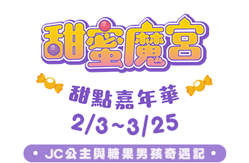 國王為JC公主請來了世界各地最厲害的糖果製造商,集結甜點嘉年華市集,各式各樣的繽紛糖果等你來品嚐!
